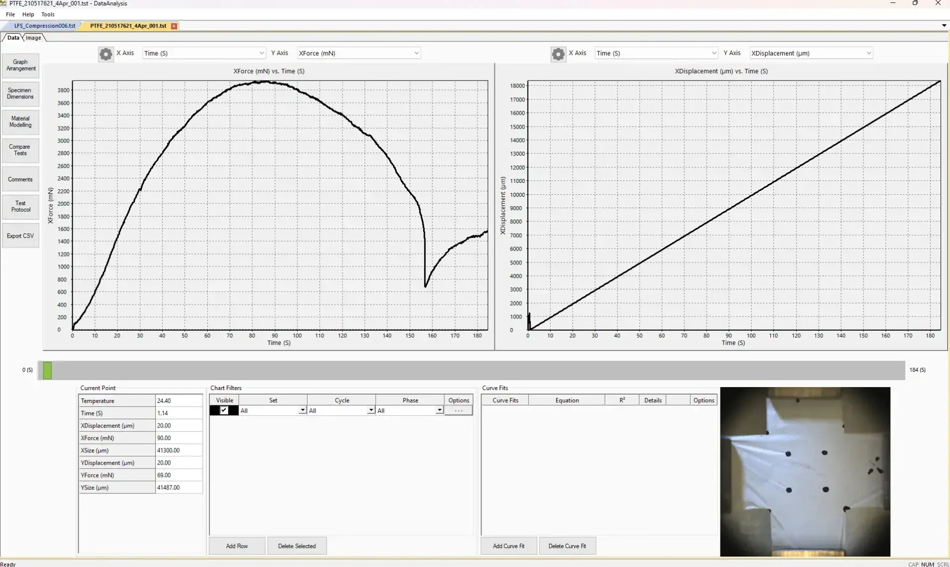 Export datasets into our Data Analysis software (also included with lifetime licence) for stress-strain analysis, viscoelastic metrics, and comparative studies across conditions. Imaging outputs can be used for documentation and, when configured, non-contact strain analysis.